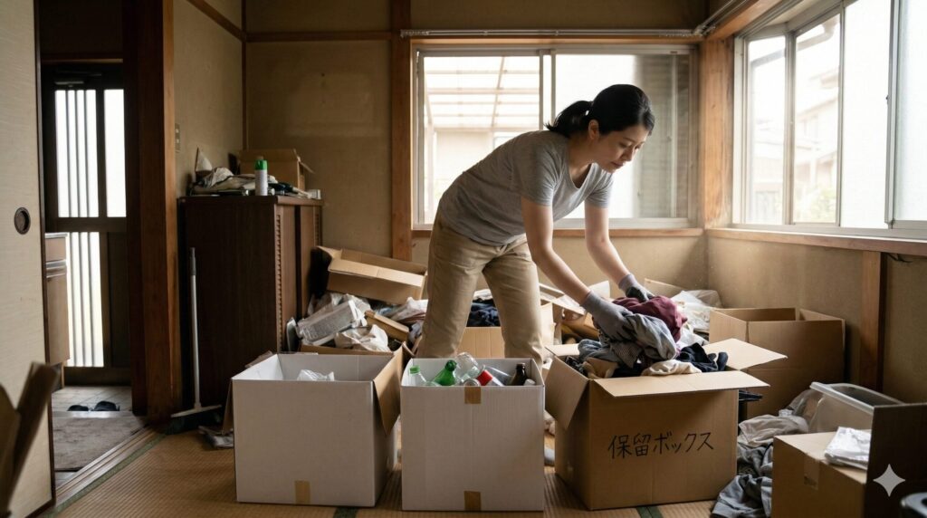 - 保留ボックスの活用:服や書類など、1秒でも迷ったものは畳まずにすべて段ボール(保留ボックス)へ投げ込む。