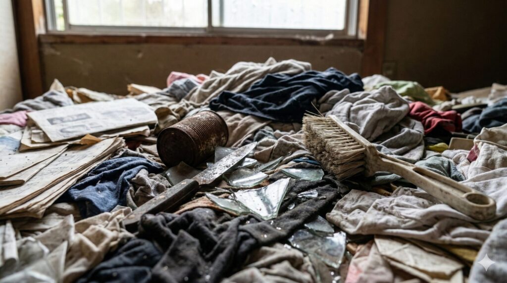 - 鋭利な危険物の存在: 雑誌や衣類の隙間に、古い包丁や割れた食器、飛び出した錆びた釘が隠れており、不用意に手を突っ込むと大怪我に直結します。