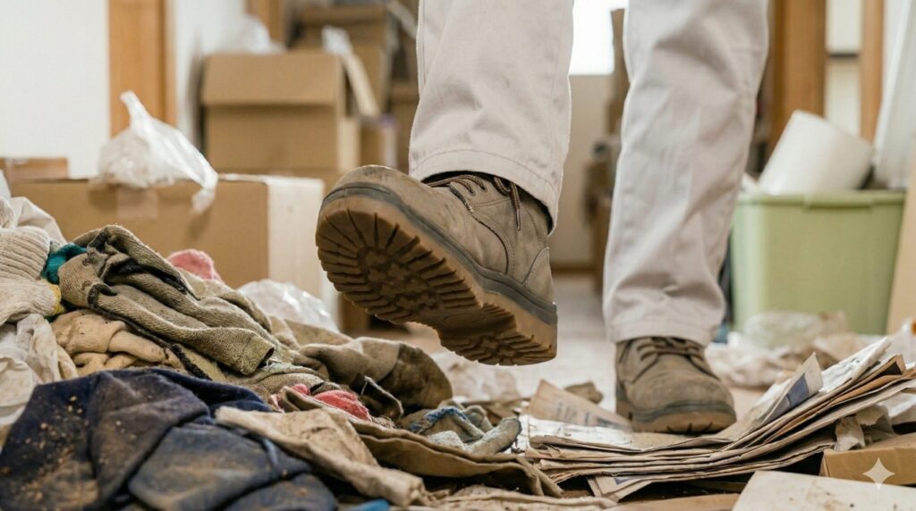 一見ただの衣類の山に見えても、それを一つ動かすたびに、埃にまみれて全く見えなくなっていた割れたガラス瓶の破片、液漏れして錆びついた乾電池、刃が剥き出しになった古い剃刀、劣化したプラスチックの鋭利な破片が容赦無く姿を現します。これらに素手や薄い装備で触れるのは非常に危険であり、怪我をするのは時間の問題です。