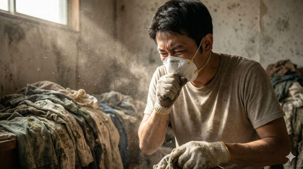 - 重篤な健康被害: 溜まったゴミを少し動かすたびに、部屋中が白く曇るほどの大量の粉塵が舞い上がります。このホコリには数十年分の黒カビの胞子、ダニの死骸、謎の細菌、害虫の排泄物が極度に凝縮されており、無防備に吸い込むと重度の喘息発作やアレルギー性肺炎を引き起こす恐れがあります。