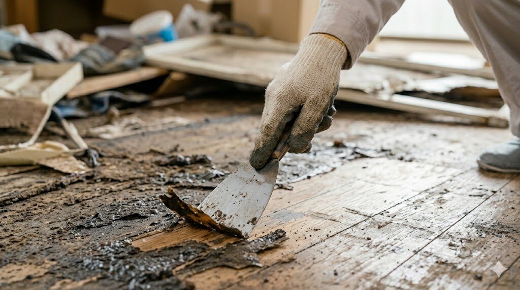 長年放置された床や壁にこびりついたドロドロの汚れは、水拭きの雑巾では汚れを塗り広げるだけで一向に落とせません。まずは金属スクレーパーを用意して、床と汚れの間に刃を入れ、固まった汚れの層を物理的に「こそぎ落とす・剥がす」ことから始めましょう。これが一番早いです。