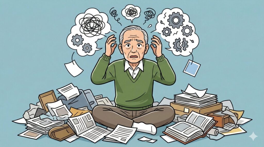 普通なら捨てるはずの空き箱やチラシが、脳内では「大切な宝物」に変換されてしまい、捨てることに猛烈な不安や恐怖を感じるようになるのです。ゴミと必要な物の境界線が消えてしまうのは、性格が変わったからではなく、脳の器質的な変化の可能性があると言えるでしょう。